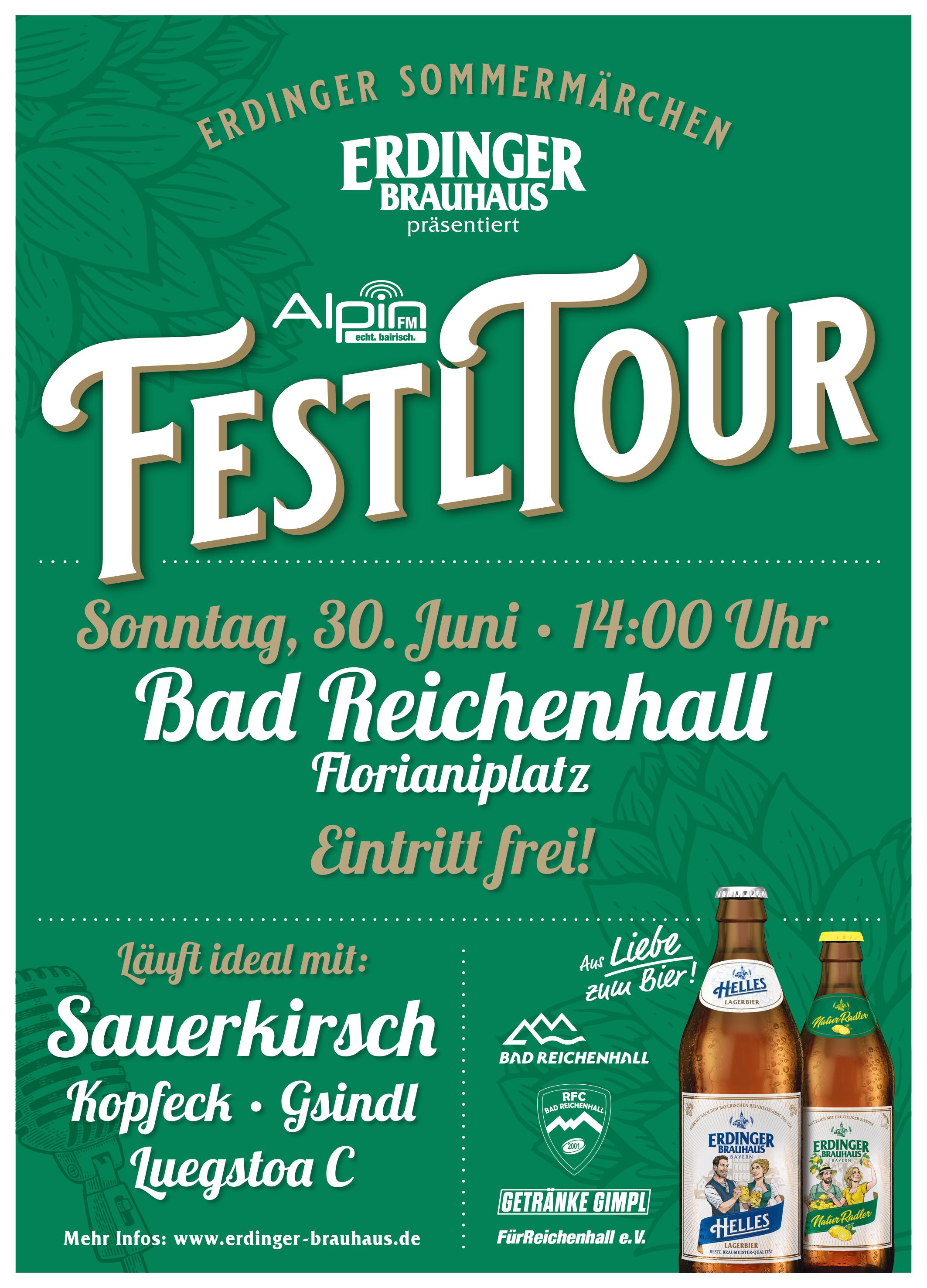 Auftakt ist am Sonntag, den 30. Juni, auf dem Florianiplatz, mitten in der historischen Altstadt von Bad Reichenhall. Ab 14 Uhr verwandelt sich der malerisch gelegene Platz in eine Festhochburg. Für ordentliche Stimmung und eine mitreißende Atmosphäre sorgen in diesem Jahr die Live-Auftritte der bayerischen Bands Kopfeck, Luegstoa C, Gsindl und Sauerkirsch. Der Eintritt ist frei und um das leibliche Wohl kümmern sich das ERDINGER Brauhaus-Team mit der Unterstützung des Vereins „FürReichenhall e.V.“. Damit es an nichts fehlt, werden die Gäste sowohl mit ERDINGER Brauhaus Spezialitäten und alkoholfreien Getränken als auch deftigen Grillspezialitäten versorgt. Dank der großzügigen Unterstützung des Stadtmarketings Bad Reichenhall kann die Alpin FM Festl Tour richtig durchstarten. Alpin FM, die Bands sowie der lokale Verein „FürReichenhall e.V. und ERDINGER Brauhaus heißen jeden herzlich willkommen, mitzufeiern und die einzigartige Atmosphäre zu erleben!