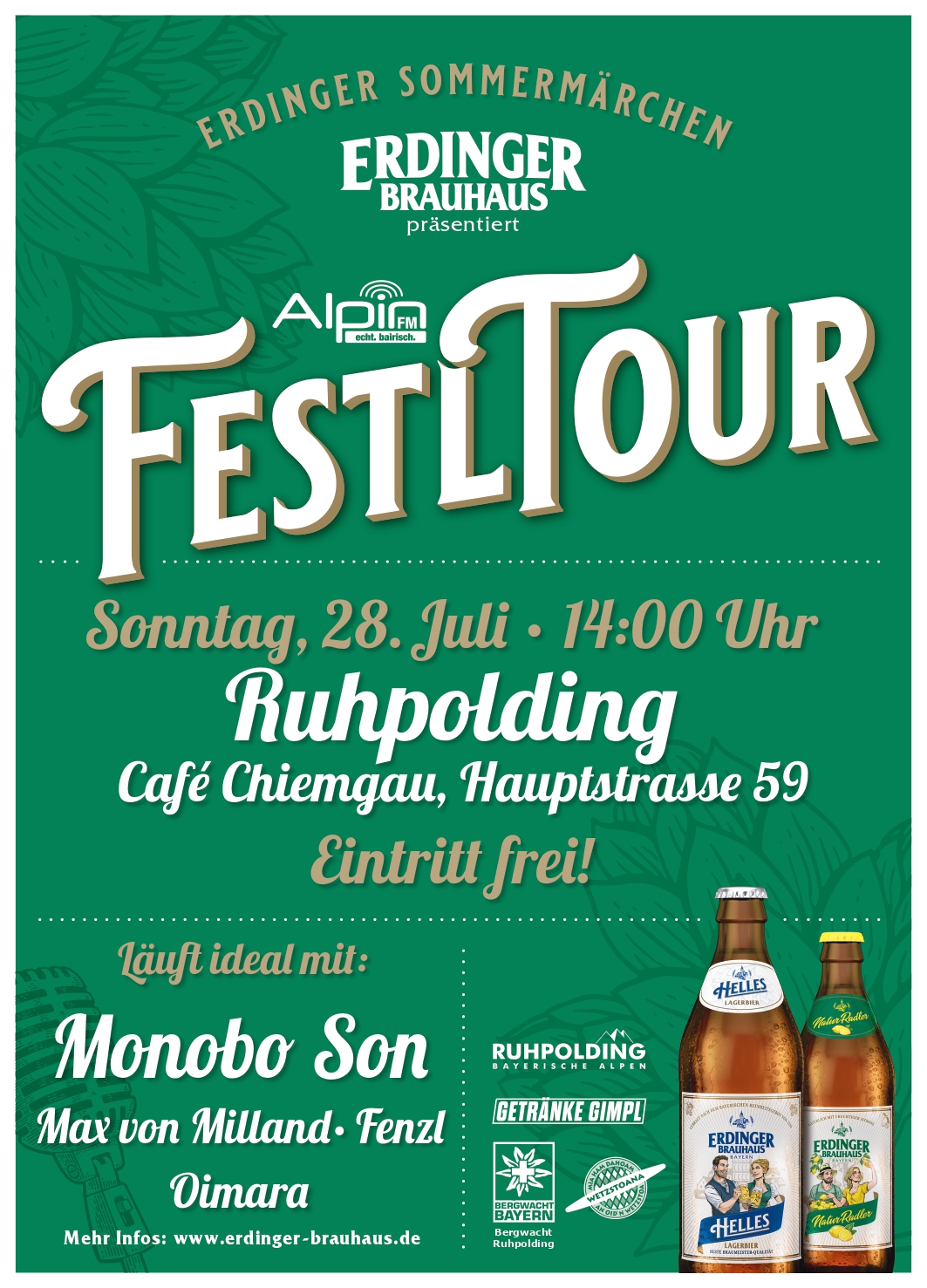Am Sonntag, den 28. Juli, wird rund ums urige Café Chiemgau (Hauptstraße 59), ab 14 Uhr die große Party steigen! Mit von der Partie ist die Spitzenklasse bayerischer Mundart-Bands: Max von Milland, Fenzl, Oimara und Monobo Son. Doch nicht nur auf den Ohren wird's heiß, auch beim leiblichen Wohl bleibt kein Wunsch offen. Familie Heigermoser vom Café Chiemgau verwöhnt mit hausgemachten Leckereien, während die Bergwacht Ruhpolding ordentlich den Grill anheizt und für deftige Schmankerl sorgt. Die Wetzstoana und Getränke Gimpl schenken ERDINGER Brauhaus-Spezialitäten und erfrischende alkoholfreie Getränke aus – da bleibt keine Kehle durstig! Rein ins Vergnügen, gemeinsam abfeiern und einen einzigartigen Tag genießen! Der Eintritt ist frei. Alpin FM, die Bands sowie die lokalen Partner und ERDINGER Brauhaus freuen sich über jeden Gast!